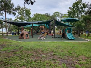 The park’s nature-inspired playground, a gift from the Dunedin Youth Guild, delights youngsters with designs resembling butterflies, ant hills, caterpillars, giant bird eggs, and even tree-like structures